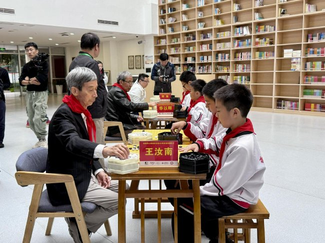 仪式结束后,陈丹淮、王汝南、华以刚等与学校学生进行双面打指导棋活动。