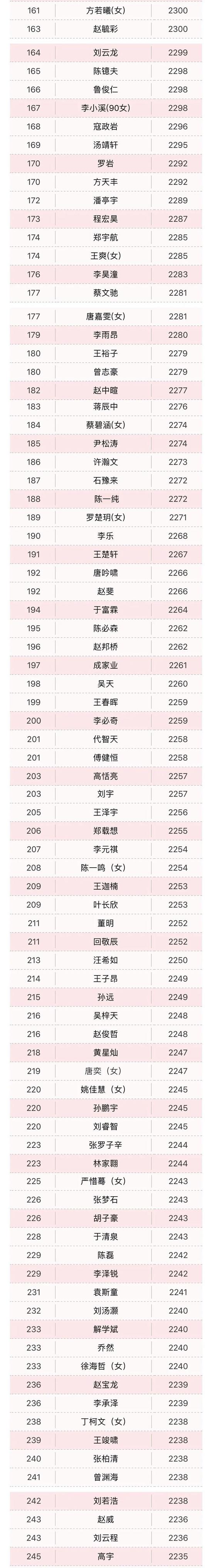 6月份没有女子赛事,前三位依旧是於之莹、周泓余、王晨星,分别是总排名的七十三、八十四、九十。