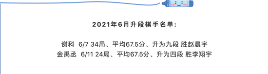 另外,本月共有两名棋手升段。分别是谢科升至九段、金禹丞升至四段。