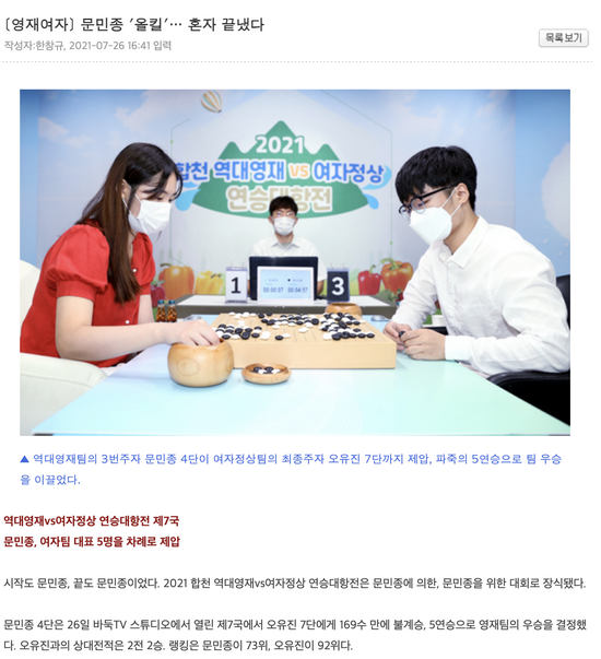 文敏钟四段一人击败了5名女队选手,被认为是新一代棋手的新锐强者。2019年和2021年分别在未来之星新锐和河灿锡国手杯英才最强赛中夺冠。