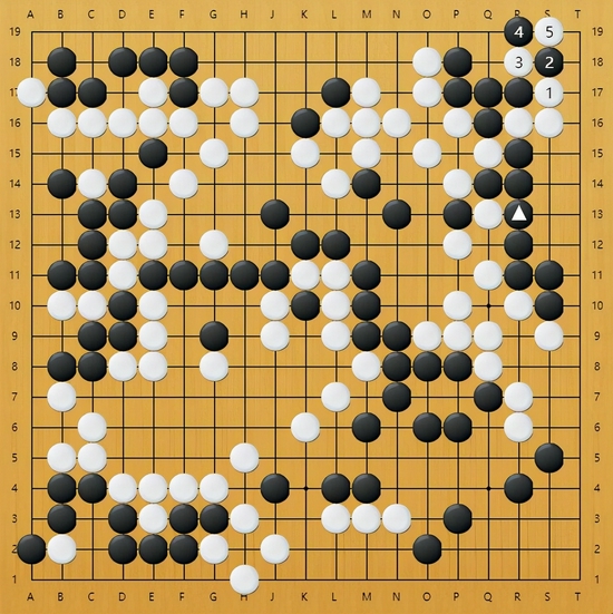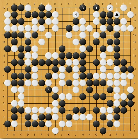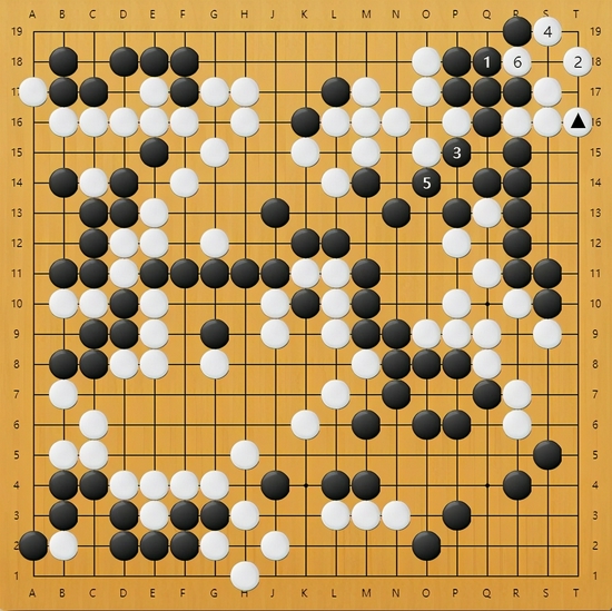 图5:实战右上角白棋走出一块打劫活,局部看似成功了,但黑棋已经先手在中央提了白棋两子,有所收获,更关键的是,黑棋整体变厚了,劫材的优劣颠倒了。
