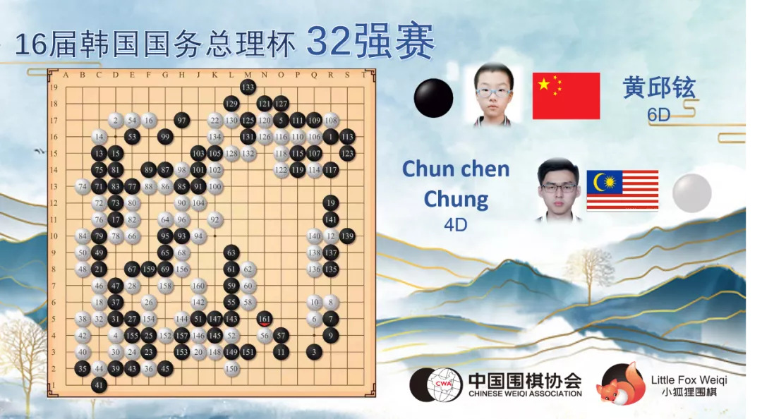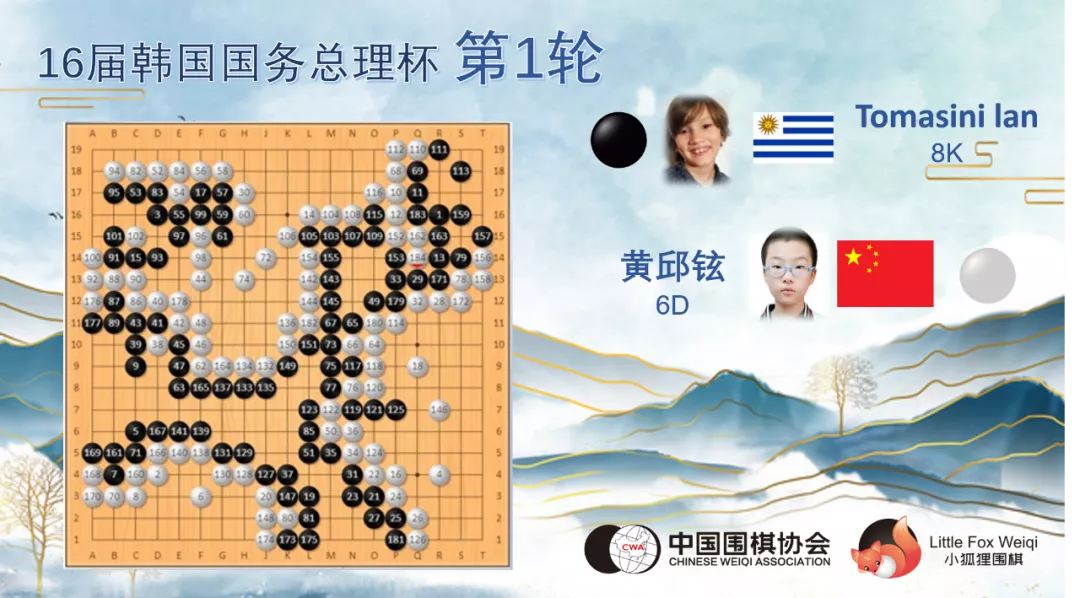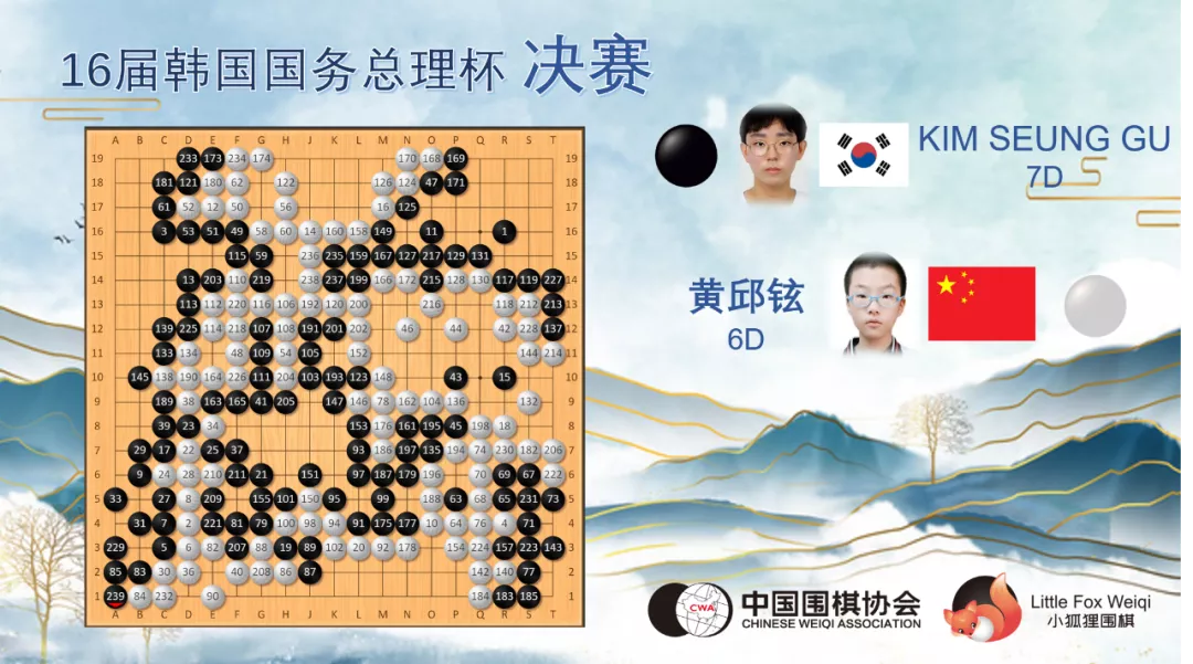 在决赛中,黄邱铉与东道主棋手15岁的韩国棋院院生金承九相遇,开局双方下的稳扎稳打,金承九处于稍微领先的状态,黄邱铉在下方切断黑棋三子后取得一定实地,中盘阶段黄邱铉多次想挑起战斗都被对手巧妙躲避。最终,金承九没有给黄邱铉任何机会,以239手取得胜利。