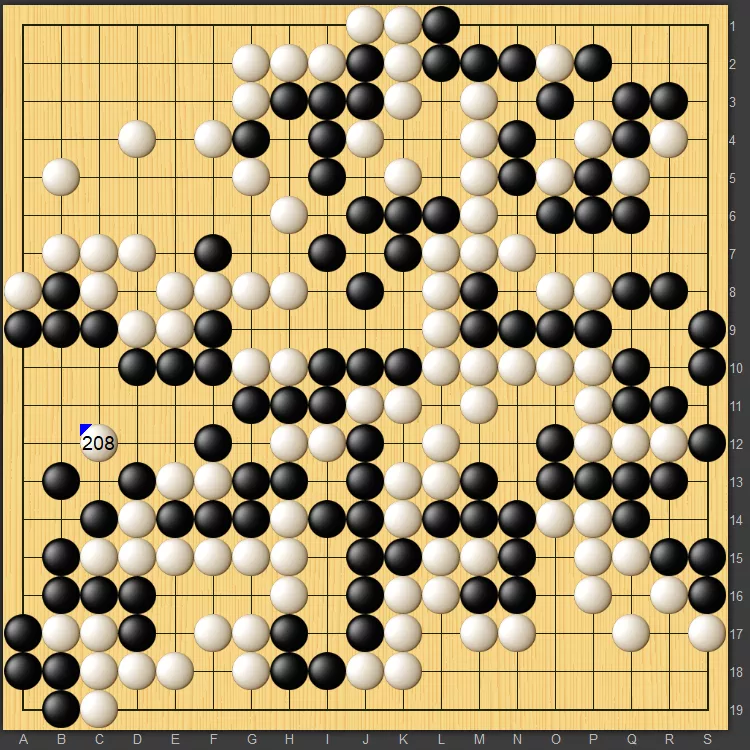 由于升降番棋不贴目,依照先相先棋份,过惕生可以拿四盘黑棋。前三局都是执黑者胜,第四局执白的刘棣怀强手出击中盘大胜,率先“破发”,第五局对于执白的过惕生就至为关键。此局刘棣怀一路占优,但因优势意识过浓,官子阶段被逐渐追上。白208是决定性的妙手,此前黑如抢先在A8位立则必胜无疑,而白如简单在A7位接,黑可在E12位提。实战白208点到一下,迫使黑棋多补一手,便宜1目而成和棋,一步棋左右了整场比赛的结果。