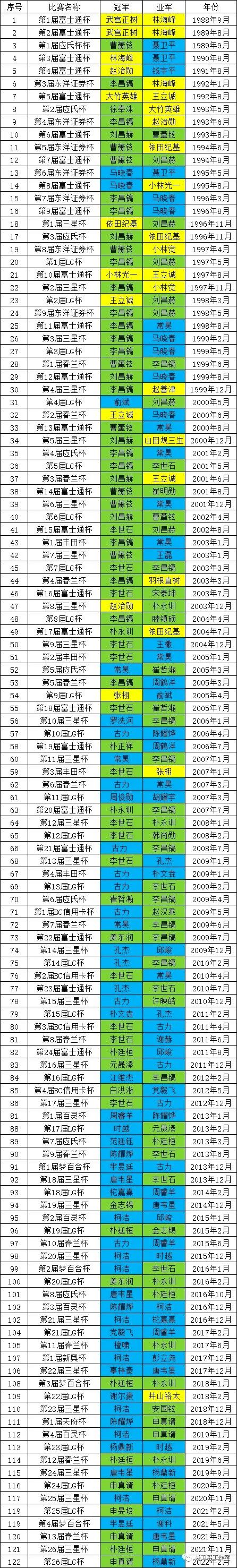 通算世界围棋冠军数排名: