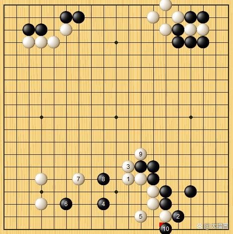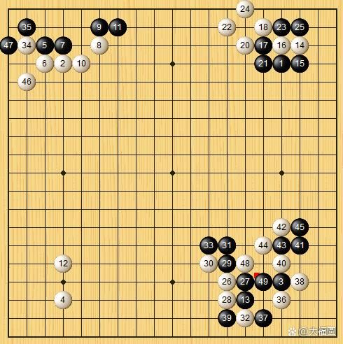 白34扳,先手利。这手棋,应该是申旻埈九段在做出决断之前的打将。马上,他走出了白36托。黑37扳,隔断白棋。白38扳,想在右下角借力打力。