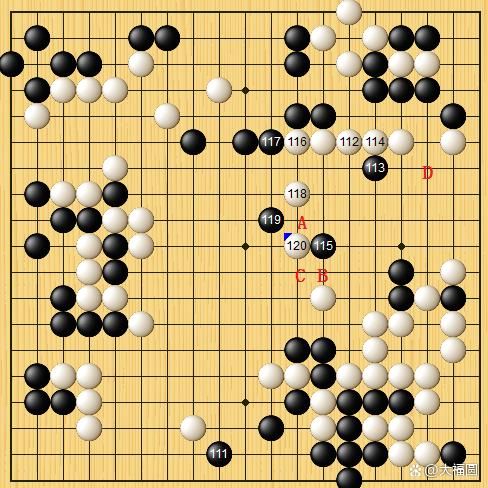 白116长,黑117顶。白118跳,白棋想积蓄力量攻击黑115。黑119小飞,让白棋感到难办。申旻埈九段苦思半晌,走出了白120靠。