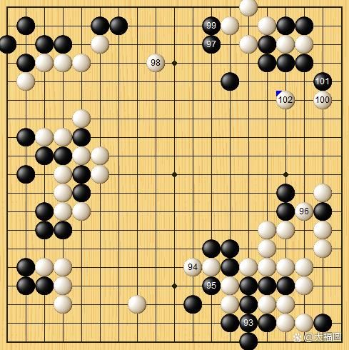 黑97飞压,申旻埈九段苦思良久。白98,终于选择了弃子。白100,先手利。白102跳起,申旻埈认为白棋如果能够围住右边的大空,胜负尚可一争。