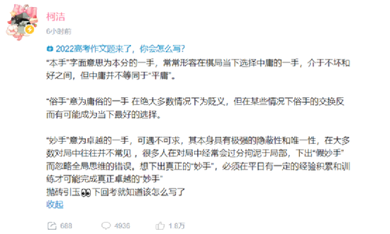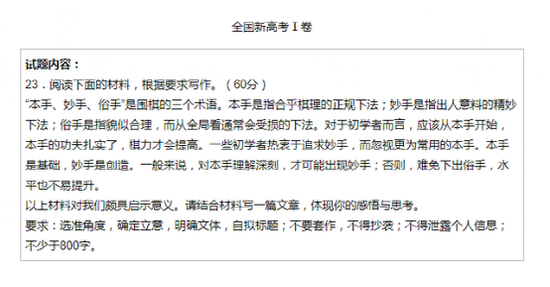 6月7日,2022年高考学子步入考场,在福建、广东、江苏、山东、湖北、湖南、河北七省市打开语文试卷的考生会发现,重中之重的作文题目以围棋“本手、妙手、俗手”三个术语为材料,根据对三种围棋下法及其关系的理解,完成占语文总分五分之二的写作。学过围棋的学生看到这样的题目必定倍感亲切,更易入手。