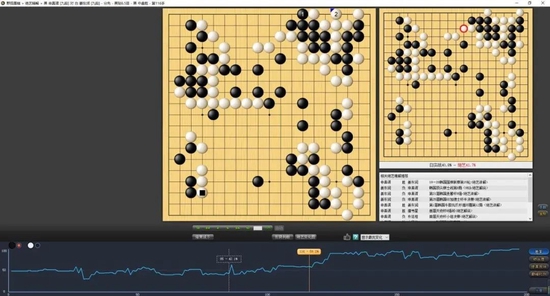 申真谞执黑以向小目开局,左上角黑棋率先挑起战端,冲断外围白棋后进入乱战格局,但一向大局出色的申真谞选择断吃左边盘一颗白子的做法有失偏颇,被白棋一通愉快的滚打包收后,因外围白势变厚,给孤悬于中腹的两颗黑子施加压力无形中加大,白棋胜率稍稍领先。