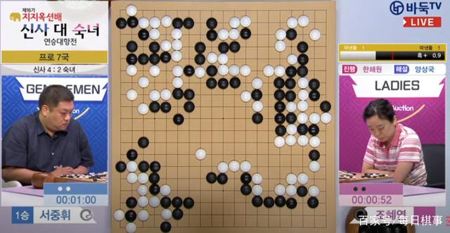 晚间韩国第16届GG拍卖杯绅士淑女擂台赛进行了第7场较量,徐仲辉执白胜赵惠连,取得2连胜。这样绅士队就以5:2继续大幅领先。