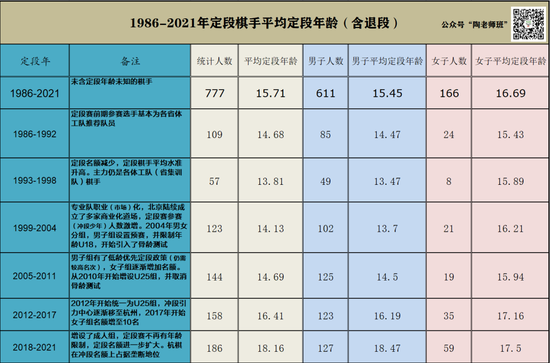 2018年开始定段年龄明显上升与增设成人组相关。仅计算青少年组,今年的平均定段年龄是14.79岁(前几年-2019年为17.23岁、2020年为15.86岁、2021年16.54岁)
