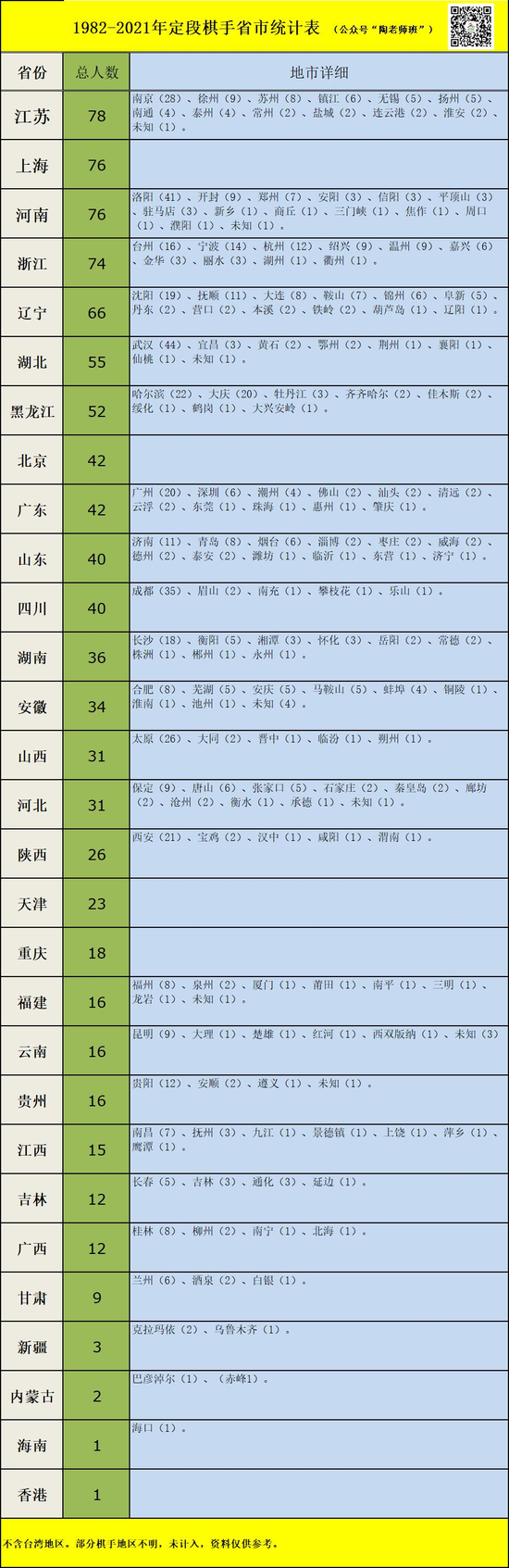 最后补下各省职业棋手榜。关于棋手的地区,其实颇费脑筋。按祖籍(老家)算显然不合适。如果按出生地或现居住地、落户地也有诸多问题。这个表基本是按身份证号所在地区或儿时成长地统计。