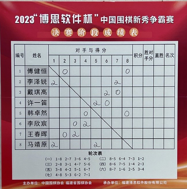 11月30日 2023“博思软件杯”中国围棋新秀争霸赛八强战的第1、2轮比赛在福州博思软件园战罢,前两轮比赛中马靖原、李泽锐发挥出色取得两连胜,王春晖、李欣宸、许一笛、戴琪高一胜一负。
