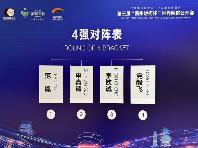 10月9日,第三届“衢州烂柯杯”世界围棋公开赛八强赛在衢州大花园国际酒店战罢;最终卫冕冠军申真谞半目战胜柁嘉熹、丁浩不敌队友李钦诚,范胤与党毅飞则分别战胜王世一、许嘉阳。半决赛将于11日继续进行,对阵为范胤VS申真谞、党毅飞VS李钦诚。