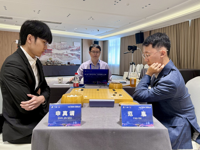 首次进入世界大赛四强的范胤八段半决赛迎战卫冕冠军申真谞,猜先后范胤执黑先行,面对沉稳的小申范胤选择积极求战,好在前半盘也取得成效胜率逐渐走高,但可惜在中盘阶段黑棋突然变调再加上计算的失误,白棋一举逆转局势;后续实战过程小申更是安全运转没有给对手一丝机会。最终申真谞中盘获胜,连续三届闯入决赛。