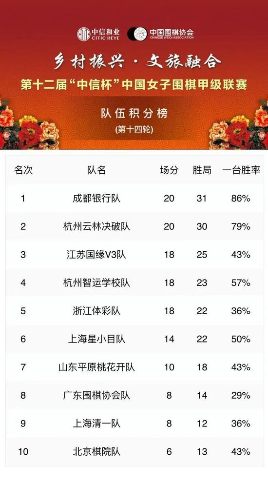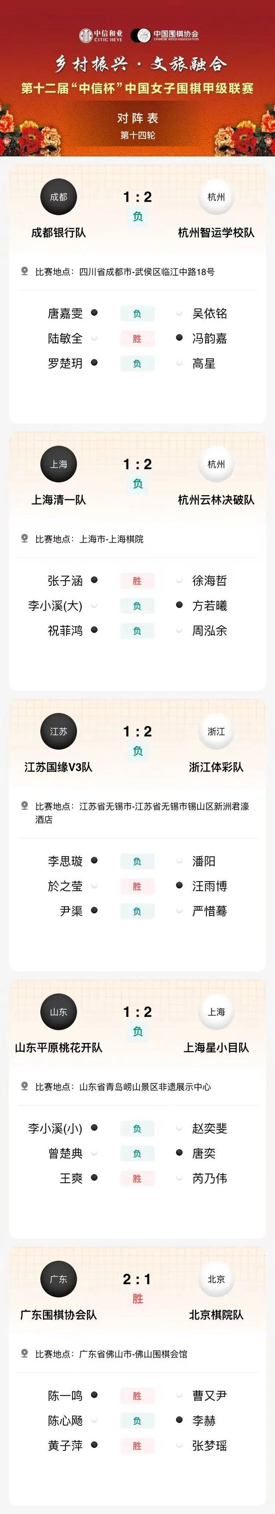 第十二届“中信杯”中国女子围棋甲级联赛第十四轮赛果: