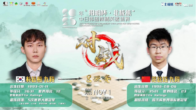 今日,2025年“阳明杯·北极熊”中日韩围棋精英邀请赛迎来第二轮(8强赛)。韩国名将朴廷桓九段作为8强中仅剩的非中国棋手,本轮与范廷钰九段的对决,注定是焦点之战。