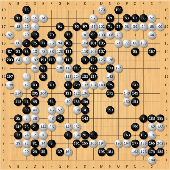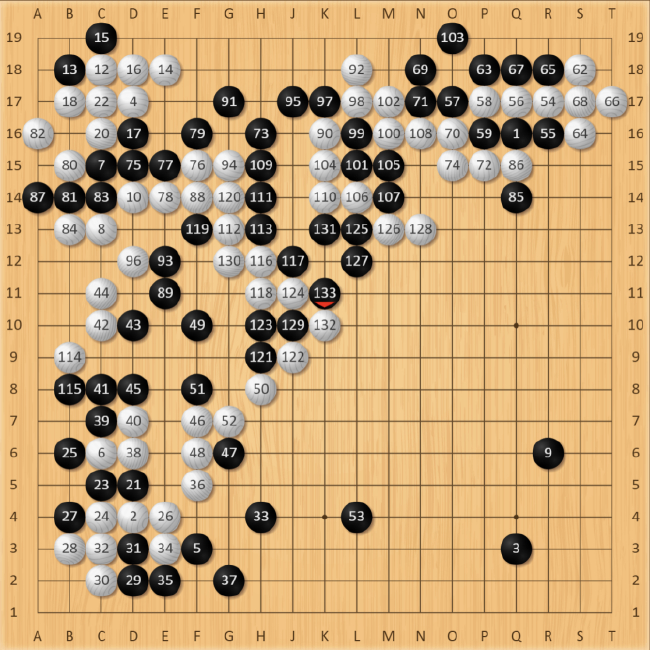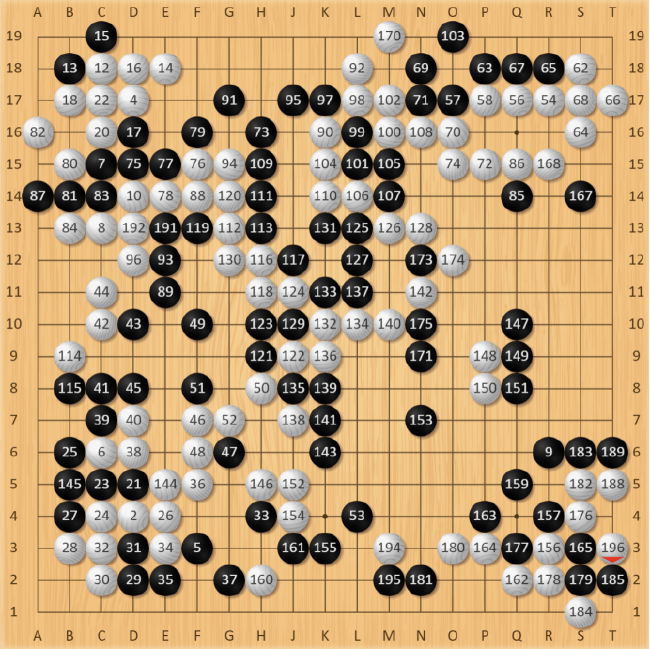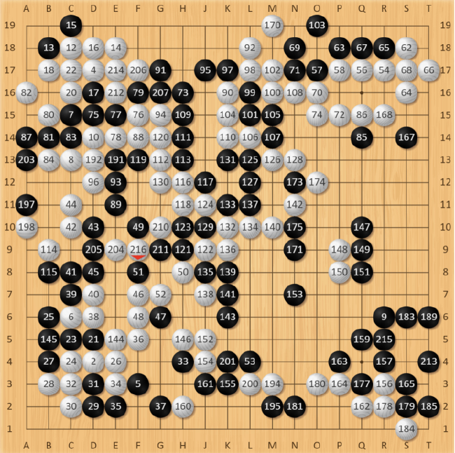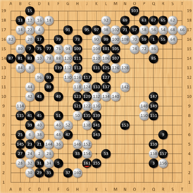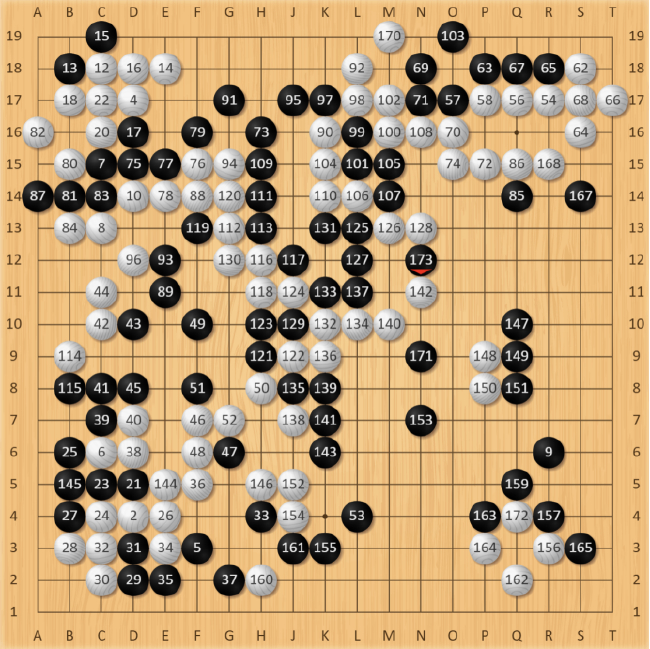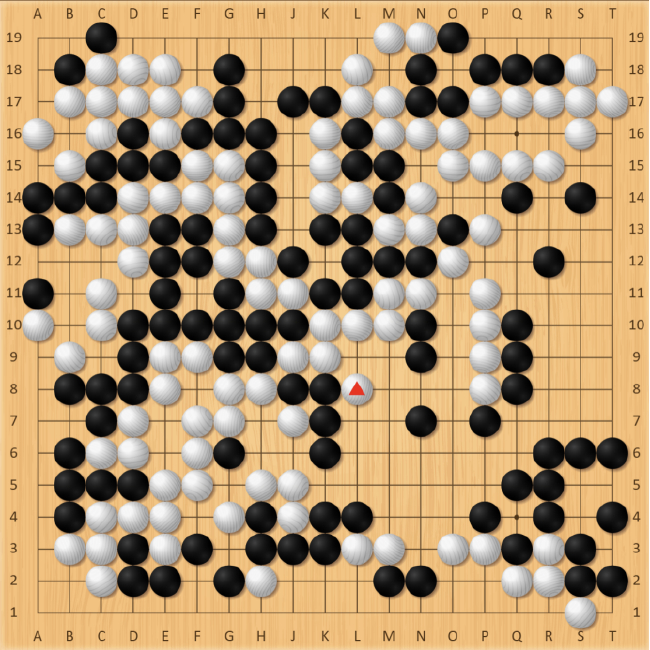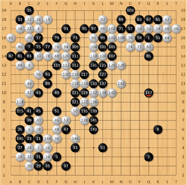 白134手长,朴廷桓抓准时机,黑135手先打吃,考验白棋。此时白棋还是应该在L11处打,但优势意识下还是选择了简单粘住。棋局突然又进入了复杂化,黑棋得到喘息机会团出一个眼,虽然暂时整体不活,但同样牵扯着白棋左边的大龙,对杀关系着复杂的劫争。先前黑135手打吃“骗”到的一手,先手把左下角大龙切断开,白棋只能仓惶补活,黑棋先手形成厚势,黑147手拆,抢到了本局最后的大场,顿时右下阵势栩栩生辉。此时,黑胜率回升到16.3%,棋局过于复杂,胜负难料。