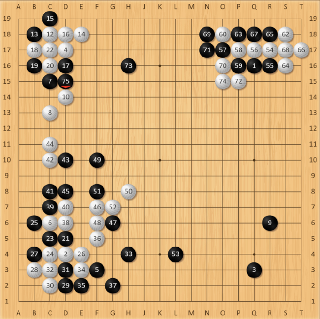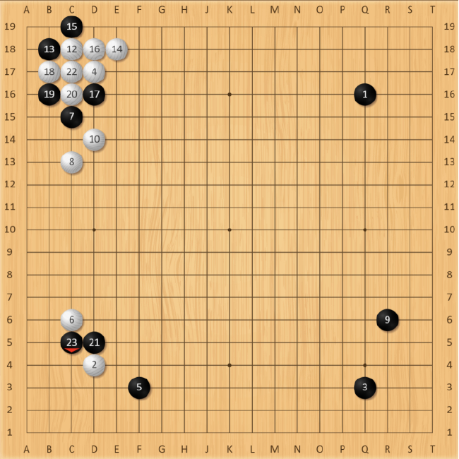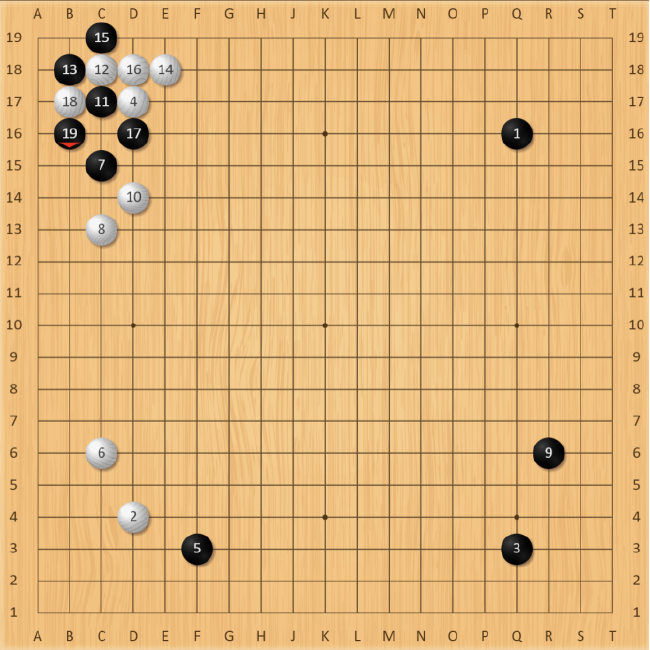 右下角随后形成了经典的“十字架”定式,常规选择白棋应该在S15处扳或者S14处飞,看实战范廷钰如何选择。