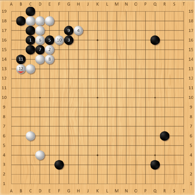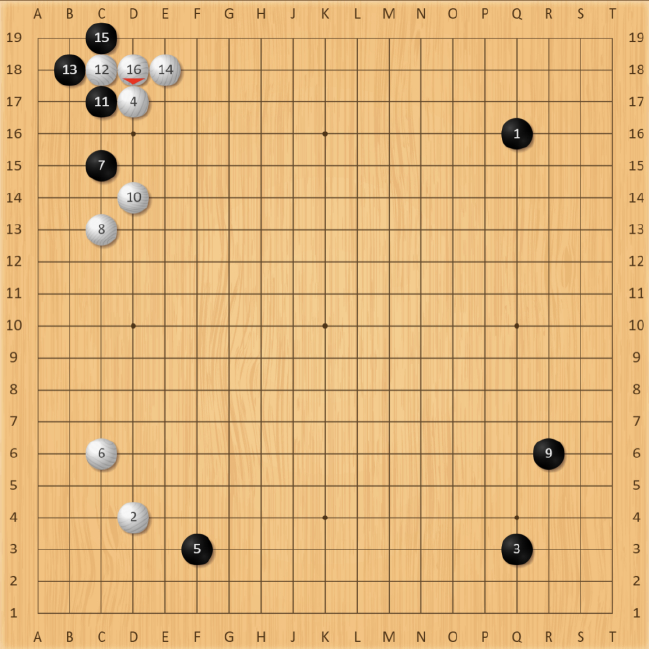 白10手小尖,欲将左上黑一子封住取势,黑11手脱角试探白棋应手,行至第16手形成常型。