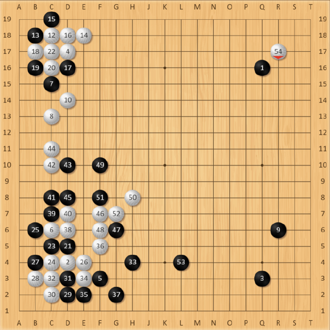 随后白棋强硬动出,经过一番智斗,白棋左下角被冲裂的小飞两子成功突围,黑棋经过进攻也颇有收获,原本右下角大飞和边上的配置结构十分完美,后续随时还可能利用白左下角大龙的薄味全部转化为实地。白54手点三三,抢占当前最大的大场。经过两位高手大开大合的对招,此时AI分析仍然是初始胜率。