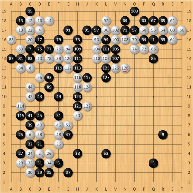 黑111手挺出,胜率骤降。直至白128手,黑棋弃掉4子后,依然面临左右为难的状况,此时AI分析黑棋胜率仅剩3.5%左右,可谓是九死一生。