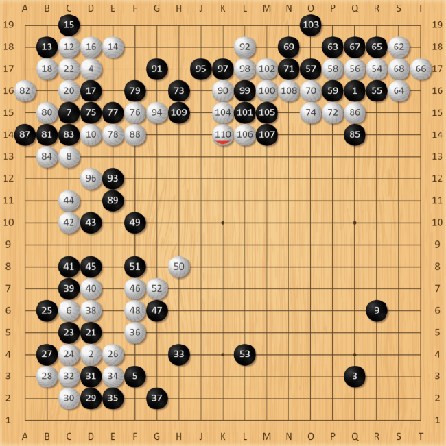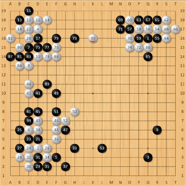白76手飞,威胁黑棋联络,黑棋愚型顶完扳过,白棋80、82手先手打拔,确保角部绝对安全。经过后续几手交换,朴廷桓做出决定,心一横!一路立,切断白棋的联络。直至白90手,左半盘“四龙缠绕”,局面复杂程度攀升。接下来的每一步对双方棋手都有着极大的考验,稍有不慎,满盘皆输。