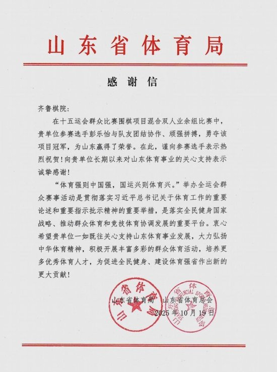 近日,从中华人民共和国第十五届运动会群众比赛围棋项目赛场传来喜讯:由齐鲁棋院选送的选手彭乐怡与队友王本东团结协作、奋勇争先,在本届全运会围棋混合双人业余组比赛中一举夺冠,为山东省赢得了荣誉。山东省体育局、山东省体育总会特向齐鲁棋院发来了感谢信,对夺冠的参赛选手表示热烈祝贺,并对该院长期以来对山东体育事业的关心与支持表示诚挚感谢。