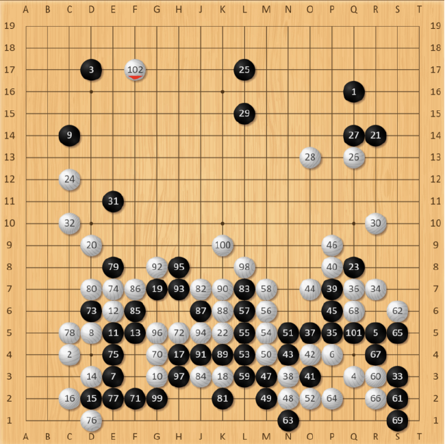 实战王星昊选择黑95手拐出,白棋先手连回两子,黑棋在下方仓惶连回,下边战役暂时结束,白棋抢到宝贵的先手第102手,投入黑棋上方阵势,此时AI分析双方差距继续拉开,白棋胜率攀升至95%左右。