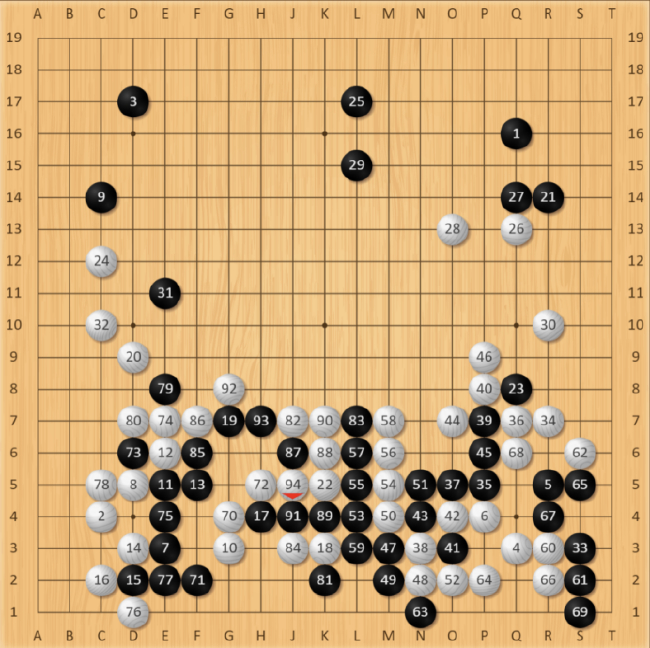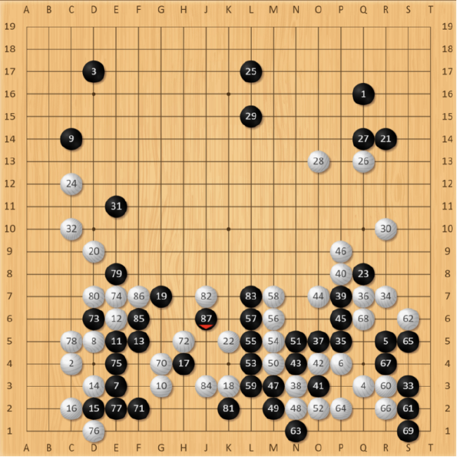 右下角战役告一段落,丁浩抢得宝贵的先手,白70手冲,欲将身陷黑阵里的白子整体逃出,后续招法丁浩都十分冷静,AI分析胜率都一直保持在90%以上,但白86手挤出现了明显问题,此时AI推荐白棋应该在H7处并,轻松逃出。估计丁浩在逃出前还想进一步便宜到对方,可王星昊作为目前中国职业围棋等级分第一人,敏锐地察觉到白棋的问题,黑87手跨!抓住了可能逆转的机会。