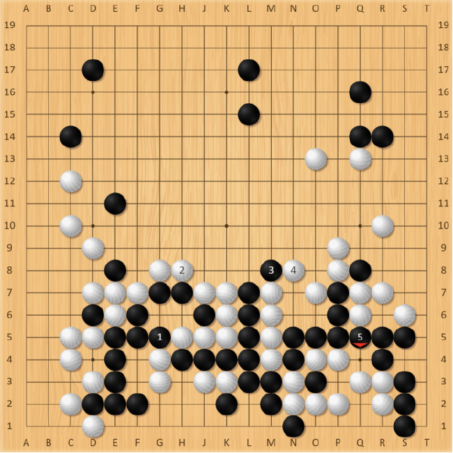 行至白94手,此时王星昊面临着两个选择,第一个是在G5处切断白棋,第二个是在H8处冲出。如若是从G5处切断,大致会形成以下变化。