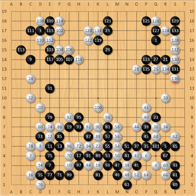 王星昊深知此时要最大限度围空,黑123手挺,但右上角三三处略显空虚,丁浩立马白124手点了进去,行至白136手,白棋从二路破坏了黑棋很多实地,AI分析白棋胜率已到达了100%,优势已经很大。