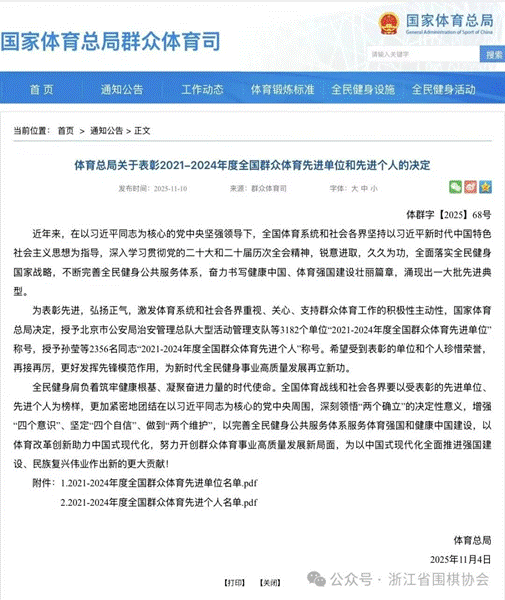 11月10日,国家体育总局正式印发《体育总局关于表彰 2021-2024 年度全国群众体育先进单位和先进个人的决定》(体群字〔2025〕68 号),杭州佛教围棋文化交流中心凭借在围棋运动普及、群众赛事搭建及文化体育融合领域的突出贡献,荣登全国群众体育先进单位榜单。
