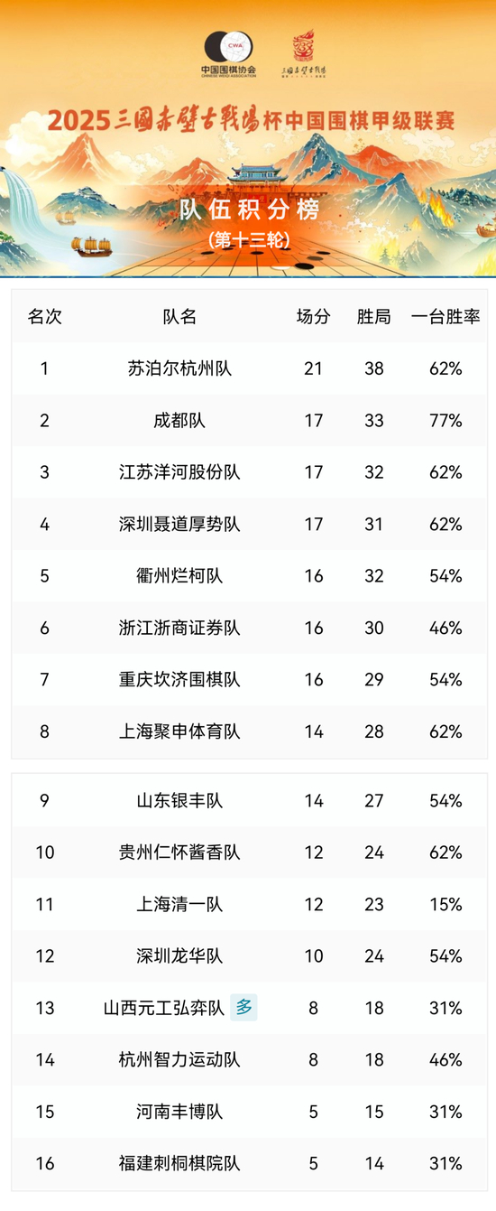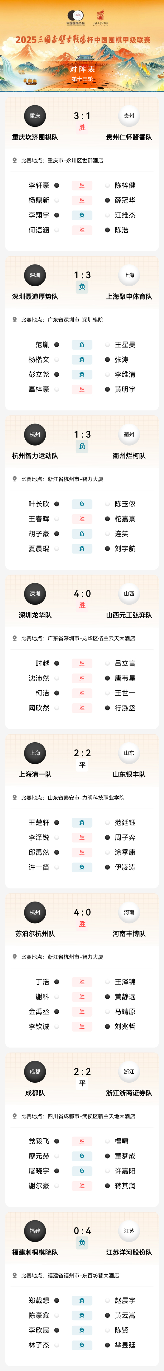 12月9日,2025三国赤壁古战场杯中国围棋甲级联赛第十三轮在重庆、广东深圳、浙江杭州、山东泰安、四川成都、福建福州各主场结束。苏泊尔杭州队4比0战胜河南丰博队,继续领跑积分榜。