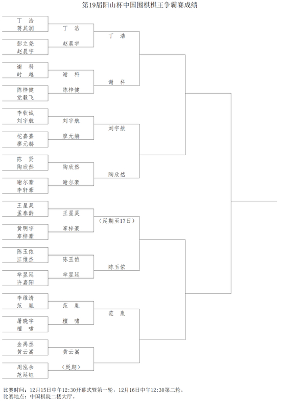 12月16日,第19届阳山杯中国围棋棋王争霸赛第二轮在北京中国棋院进行,丁浩、谢科、刘宇航、陶欣然、陈玉侬、范胤各自战胜对手,晋级8强。王星昊和辜梓豪的对局延期至明天进行,周泓余和范廷钰的对局择期进行补赛,胜者将与黄云嵩争夺8强席位。