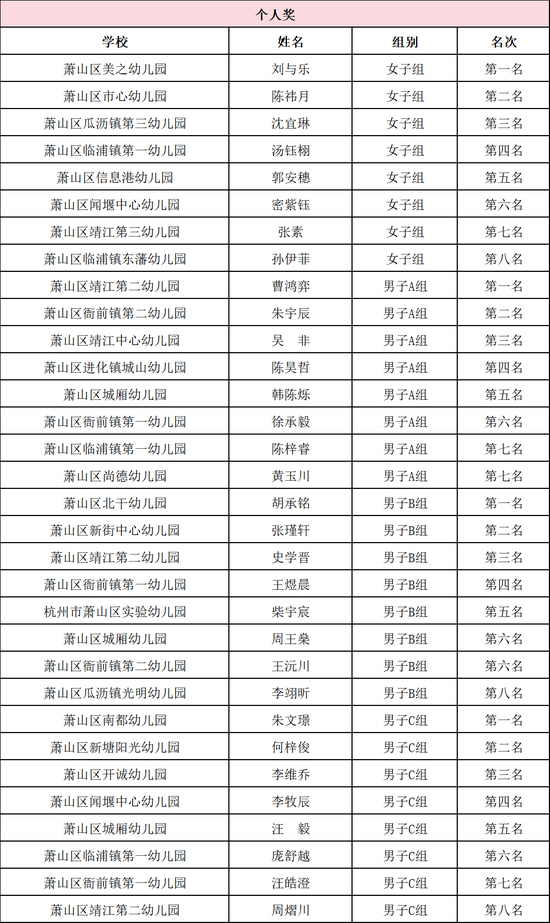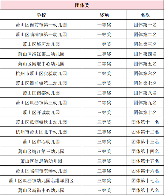 萧山区高桥幼儿园、萧山区靖江中心幼儿园、萧山区红山幼儿园、萧山区美之幼儿园、萧山区童蒙幼儿园、萧山区瓜沥镇第二幼儿园、萧山区瓜沥镇光明幼儿园、萧山区瓜沥镇七彩幼儿园、萧山区香悦幼儿园、萧山区瓜沥镇幼儿园、萧山区进化镇城山幼儿园、萧山区金海塘幼儿园、萧山区瓜沥镇党山幼儿园、萧山区彩虹幼儿园、萧山区义桥镇中心幼儿园、萧山区绿都南秀幼儿园、萧山区尚德幼儿园、萧山区金惠幼儿园、萧山区向阳幼儿园、萧山区西山幼儿园、萧山区浦阳镇森海幼儿园、萧山区汇宇幼儿园、萧山区名望府幼儿园、萧山区瓜沥镇长沙幼儿园、萧山区新街新东名苑幼儿园新丽分园、萧山区新街新东名苑幼儿园、萧山区宁围中心幼儿园、萧山区级机关幼儿园、萧山区金海塘幼儿园银河分园、萧山区南阳第三幼儿园、萧山区闻堰闻江幼儿园、萧山区闻堰三江幼儿园、萧山区博乐幼儿园、萧山区蜀山中心幼儿园、萧山区博乐幼儿园怡和分园